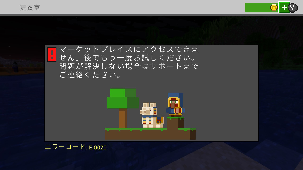 マイクラ自体のゲームはプレイできても、Microsoftアカウントやマーケットプレイスへのアクセスができないというエラーコード「E-0020」。エラーが出ると、オンライン関連の機能が使えなくなるのが特徴です。